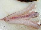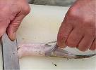 (3)頭から中骨にそって切れ目を入れる。 (4)中骨を切りとり松葉の形にして天麩羅にする。